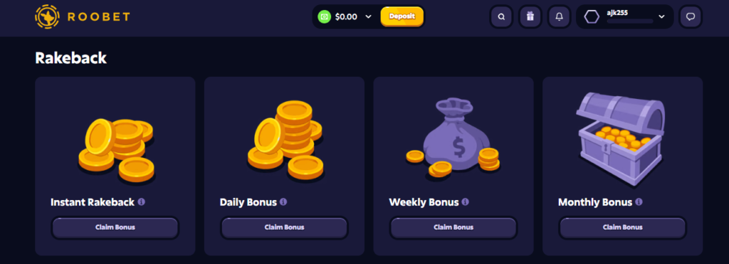 When new players sign up and enter this code during registration, they immediately unlock access to RooWards — Roobet’s built-in rewards system. From there, the benefits don’t just stop after the first session. You start qualifying for daily, weekly, and monthly bonuses just by being active on the platform. On top of that, every eligible wager earns rakeback, meaning a percentage of the house edge comes back to you automatically over time.